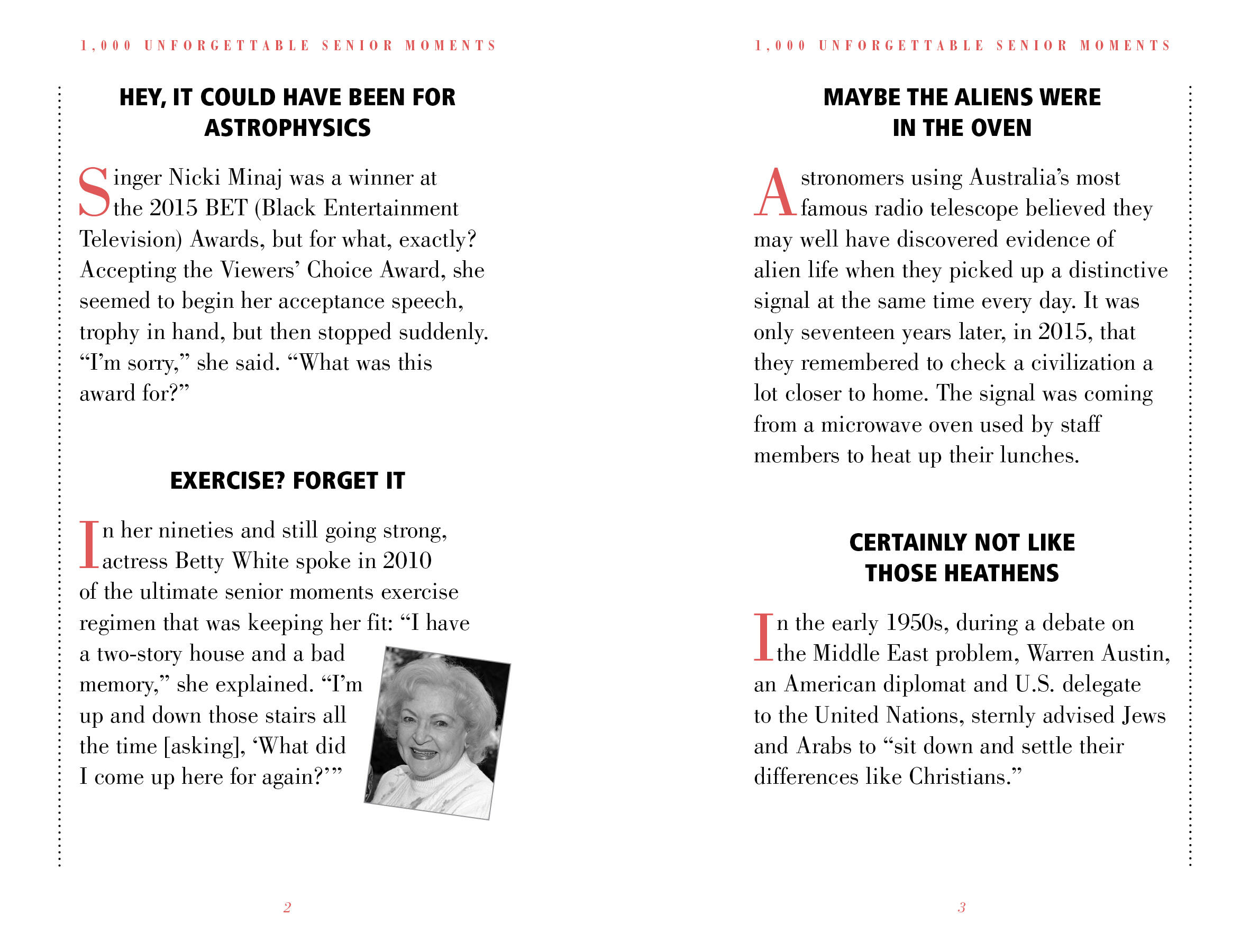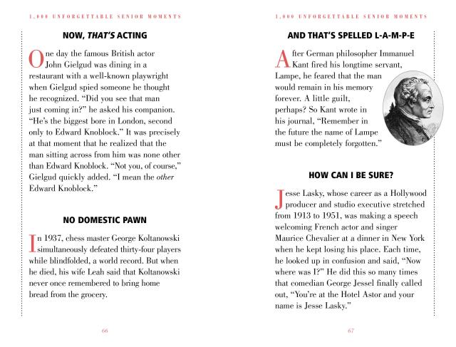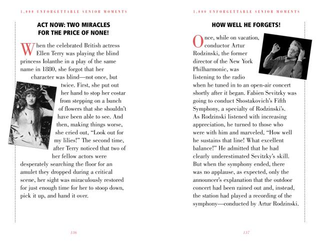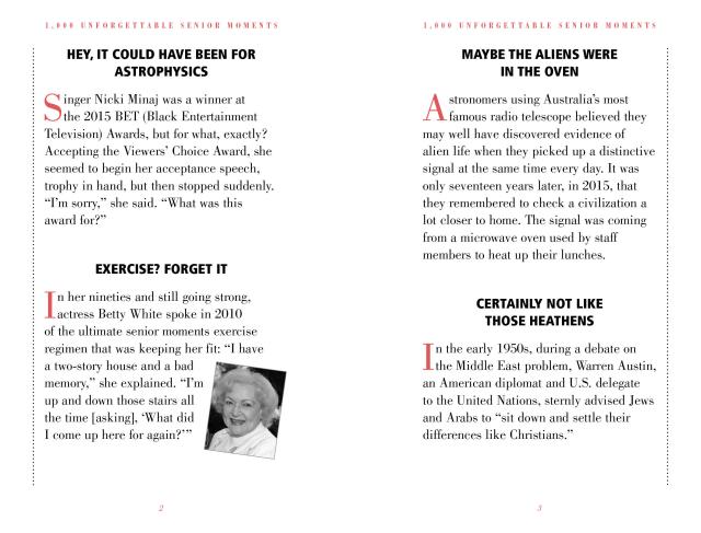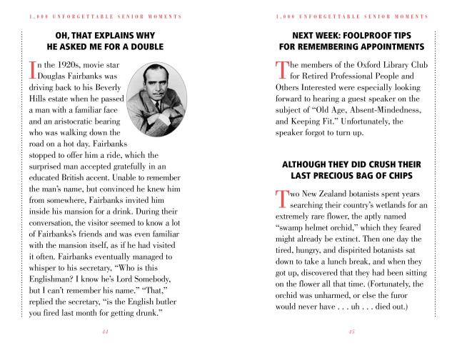 The president who left the nuclear launch codes in a suit at the dry cleaners. The novelist who put the orange juice outside and the kitten in the refrigerator. The Russian general who left home in full military dress . . . minus his pants. The famous sex goddess who blew the same line through 52 takes. And the rock star who no longer remembers 1975. Filled with classic lapses, gaffes, and mental bloopers, 1,000 Unforgettable Senior Moments is a fabulous and witty gift for anyone of a certain age. And now it is updated, revised with more than 20 percent new stories, and repackaged in two color, making it an even more vibrant, visually appealing, fresh, and compellingly readable book.