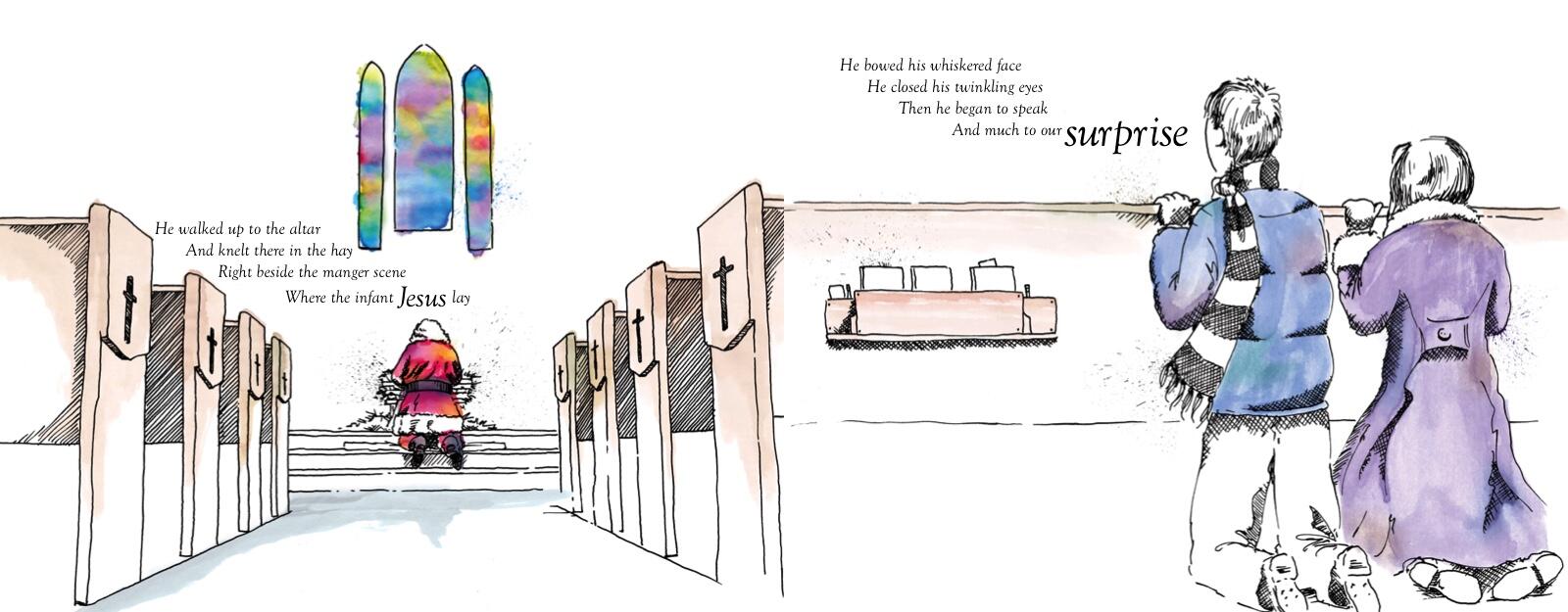 On Christmas Eve, a brother and sister stroll through their town, excitedly discussing the gifts they hope to find under the tree. Then they suddenly spy Santa quietly slipping into the church. They follow him inside, where they witness his humble prayer at the altar crèche and hear his greatest holiday wish: that children understand that Jesus is the focus at Christmas . . . and always.