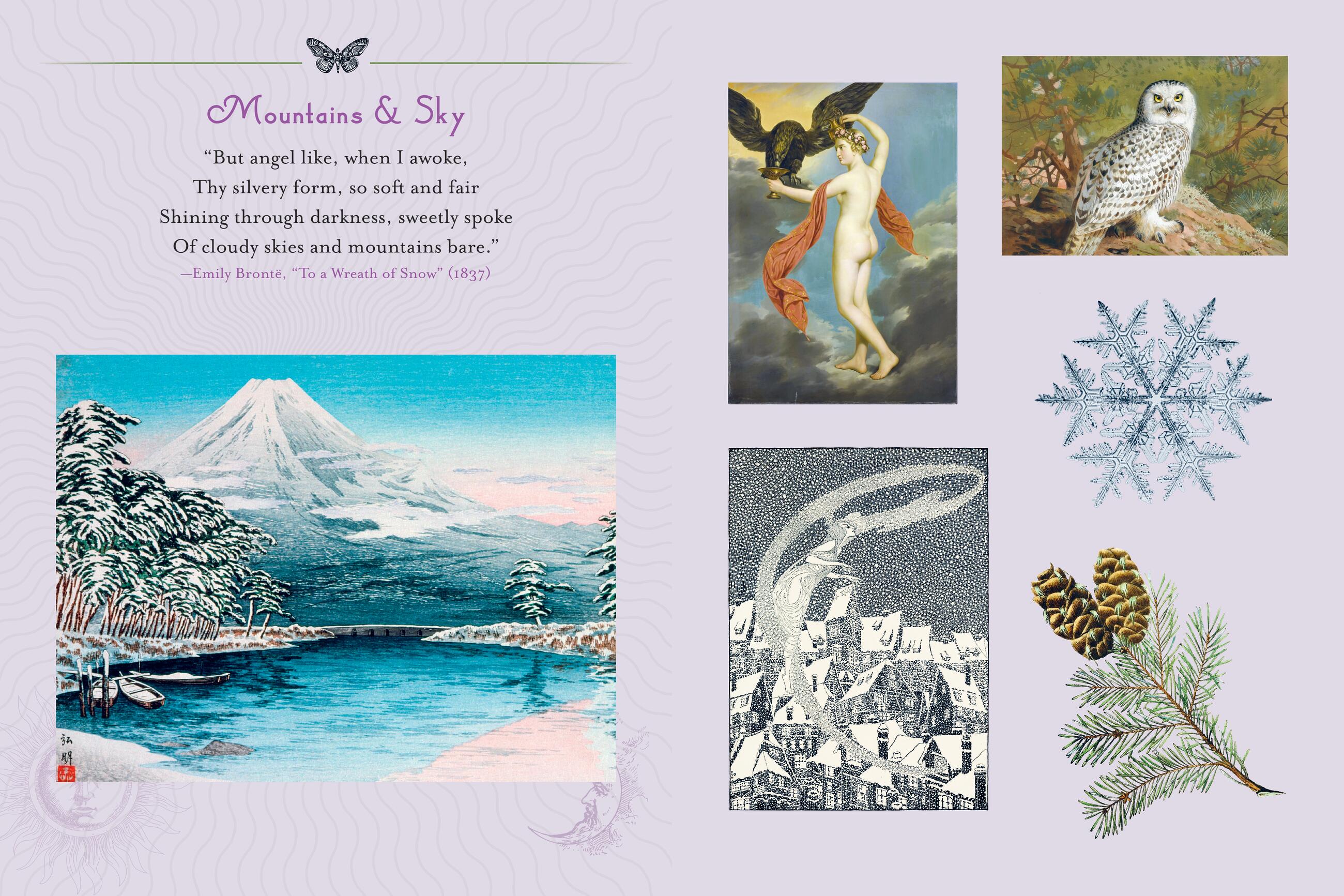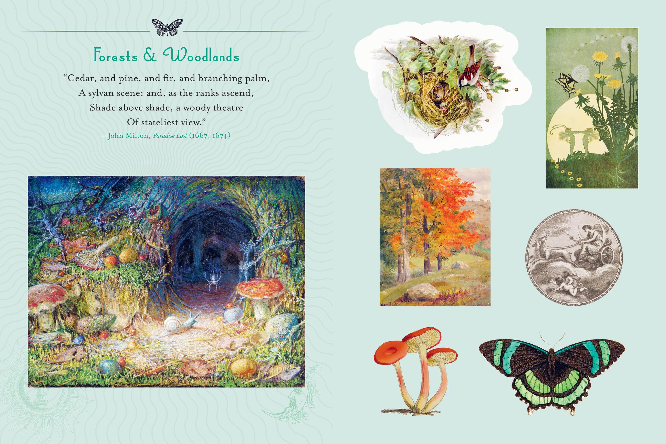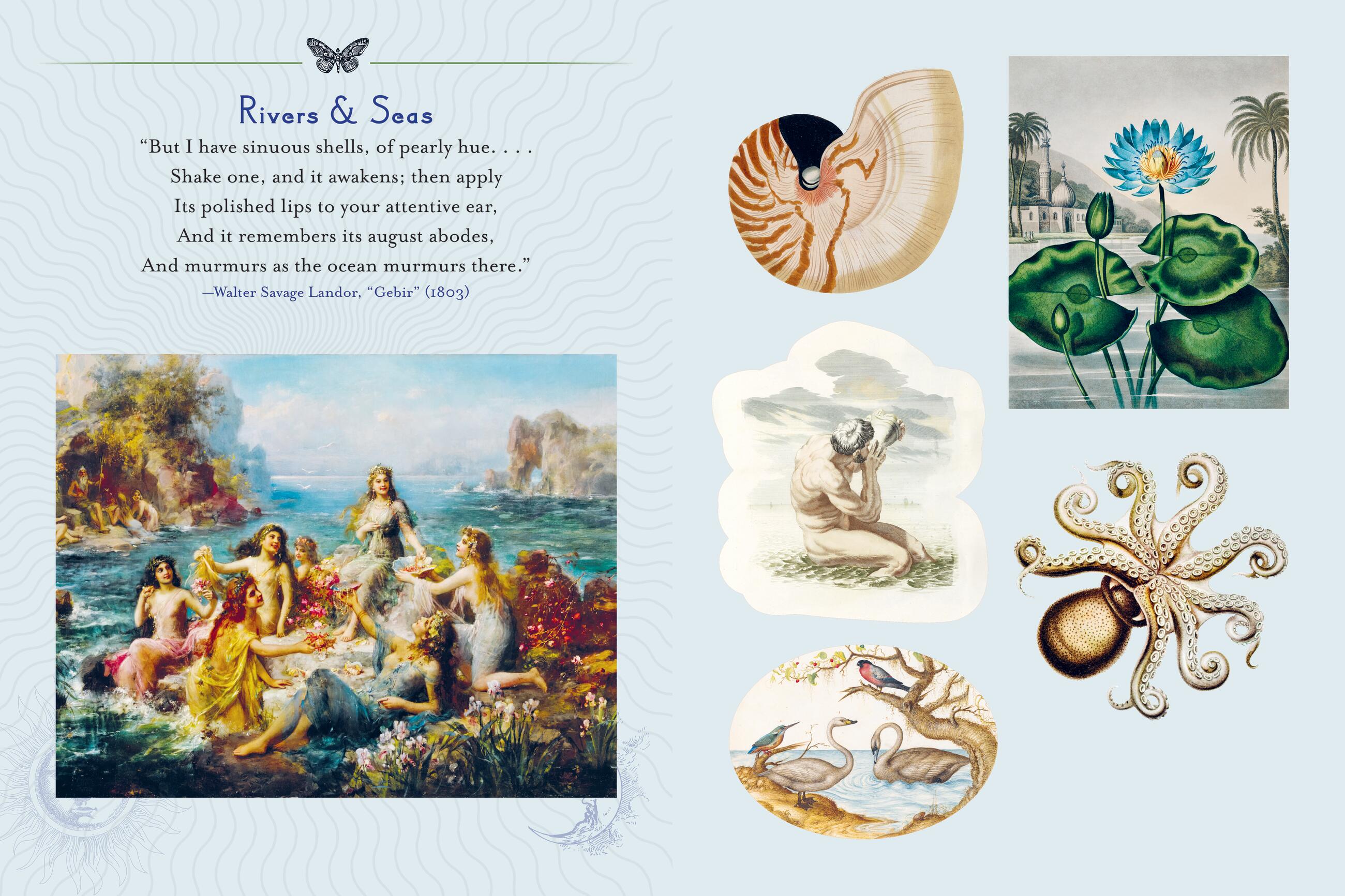 The book is organized into six sections devoted to the vibrant diversity of our planet: Rivers & Seas, Earth & Harvest, Mountains & Sky, Forests & Woodlands, Gardens & Flowers, and Deserts, Prairies & Plains—and the corresponding flora, fauna, gods, goddesses, fairies, and other mystical creatures.