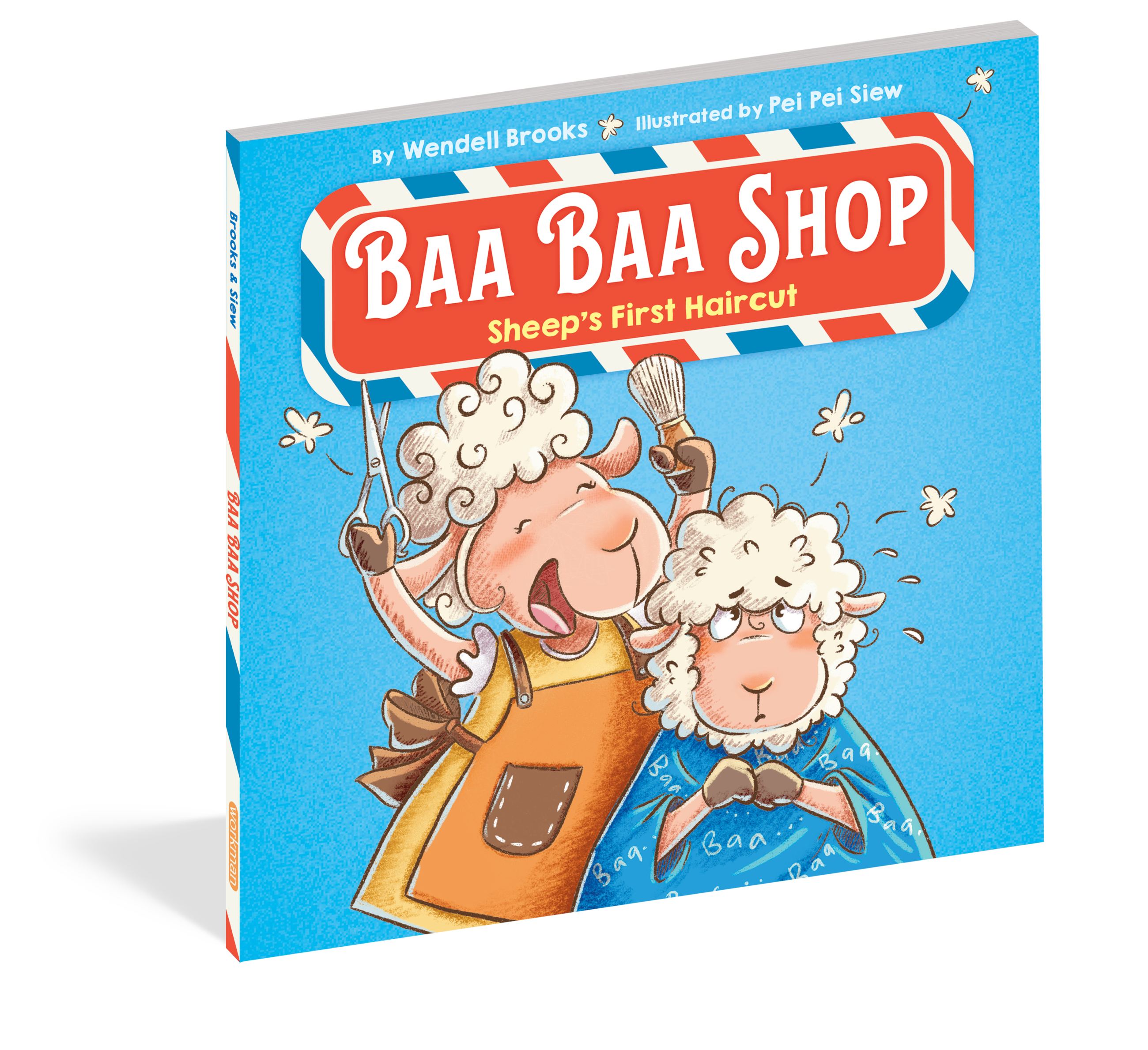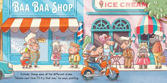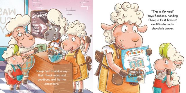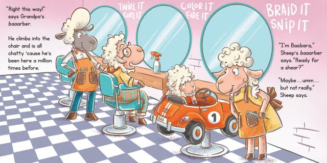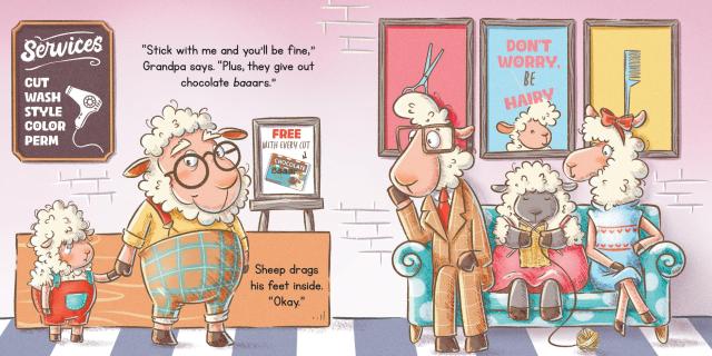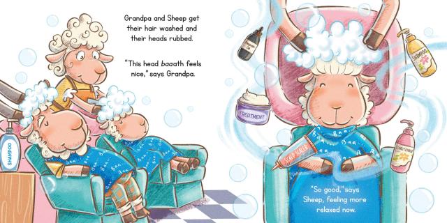 Sheep is way overdue for his first haircut—his wool flops in his eyes and it’s too fluffy on top. But like many kids who need a haircut, Sheep is apprehensive. Grandpa insists he tags along to the Baa Baa Shop where he discovers cool new styles, from an undercut to a woolly fade to free form twists. Still, Sheep isn’t so sure. He relaxes a little when his head is shampooed. Then it’s time for the shave brushes, the combs, the picks, and the sheers. Finally, Grandpa and Sheep look in the mirror and discover their BAAA-EWE-TIFUL new styles.
