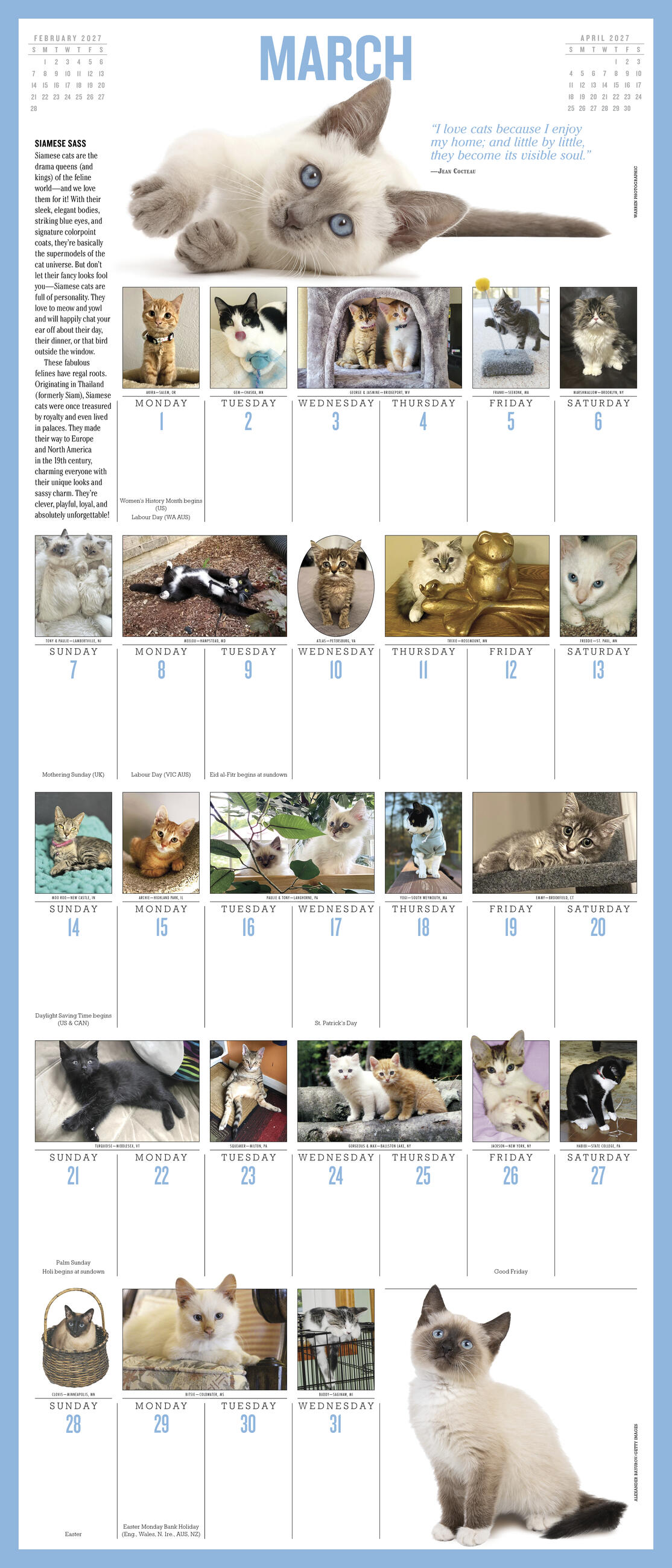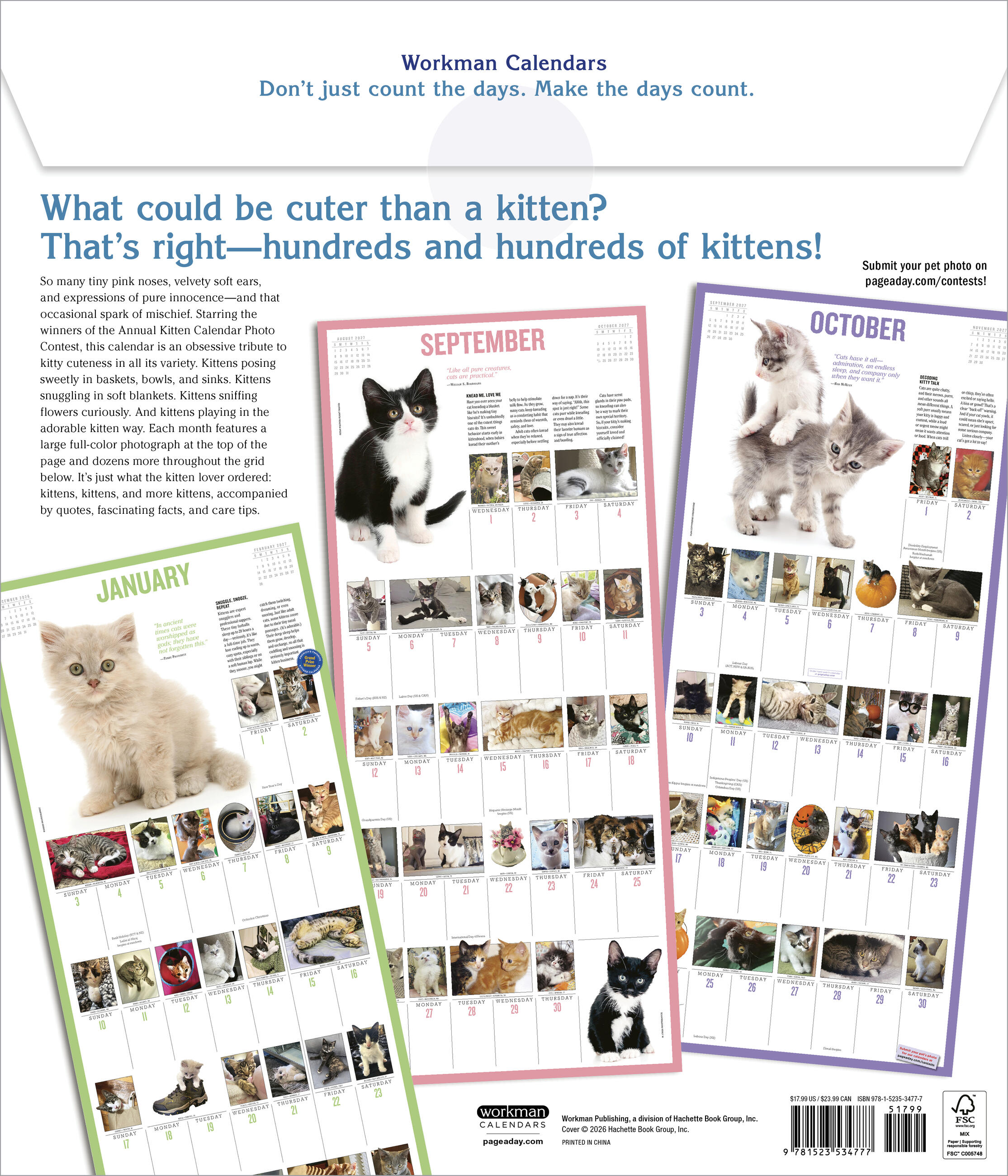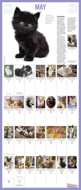 - FELINE FUN: Each month features a large full-color photograph at the top of the page and dozens more throughout the grid, plus kitten quotes, fascinating facts, and tips for caring for your cat.