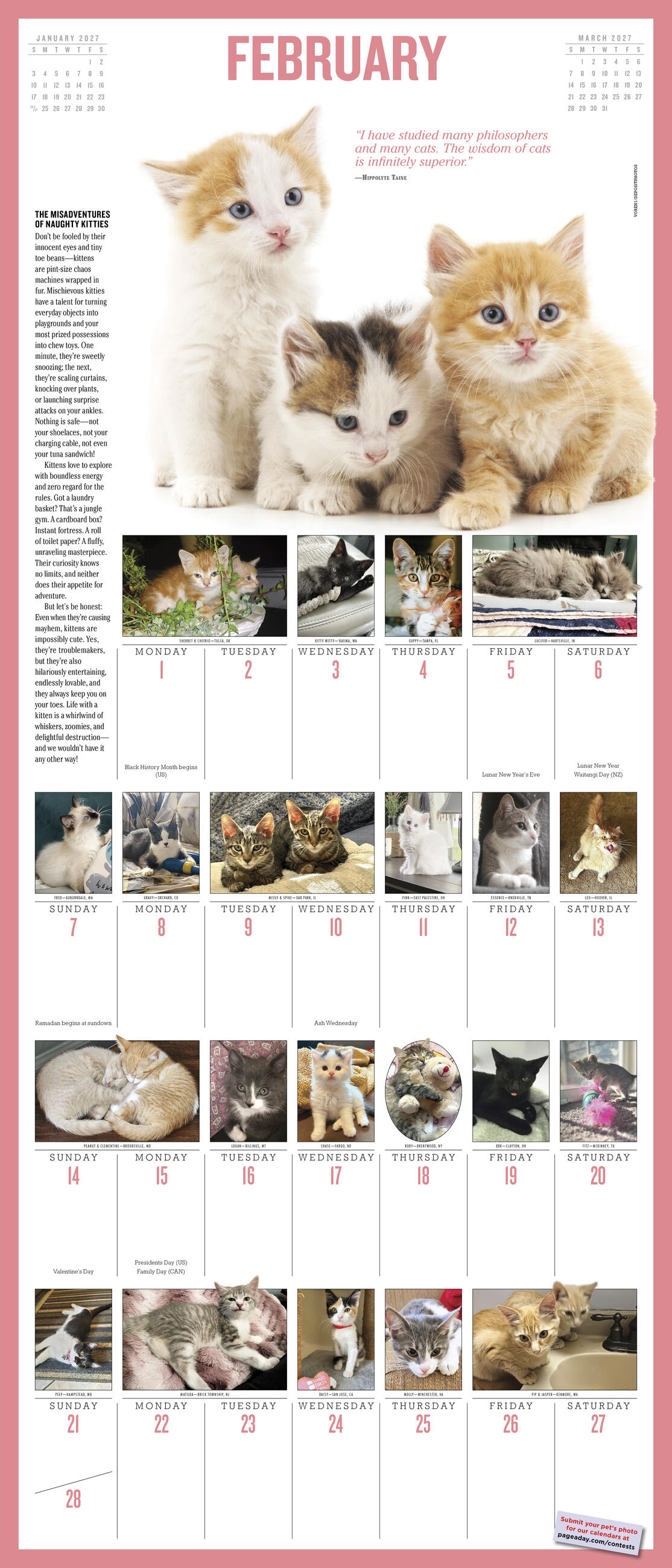 - KITTY CUTENESS: No other calendar on the market features more tiny pink noses, velvety soft ears, or mischievously sweet expressions. And they’re all winners of our Annual Kitten Calendar Photo Contest!