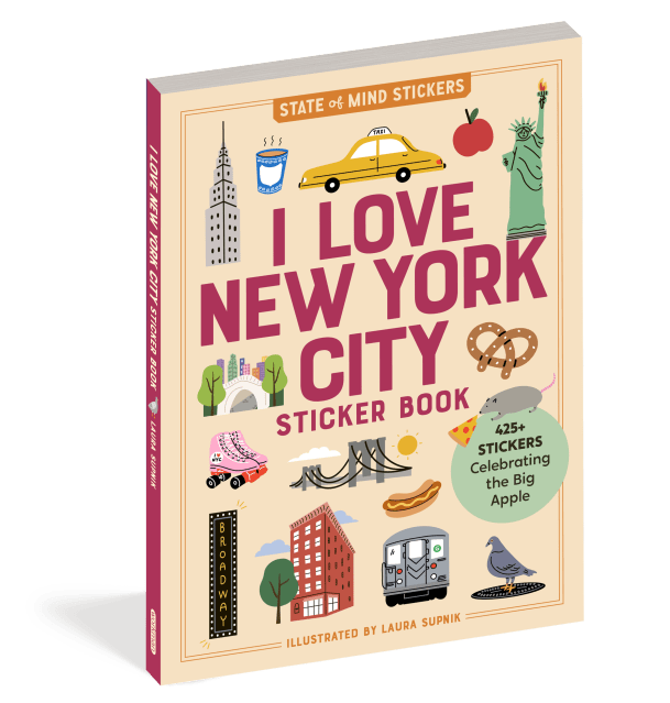 I Love New York City Sticker Book is a fun and colorful visual celebration of the Big Apple. Filled with 300+ stickers illustrated by local artist Laura Supnik, the book includes everything from yellow taxi cabs, the shining lights of Broadway, and our lovable pigeon and rat friends to all of the city’s boroughs and best-known landmarks (think Empire State Building, the Brooklyn Bridge, Staten Island Ferry, the Unisphere).