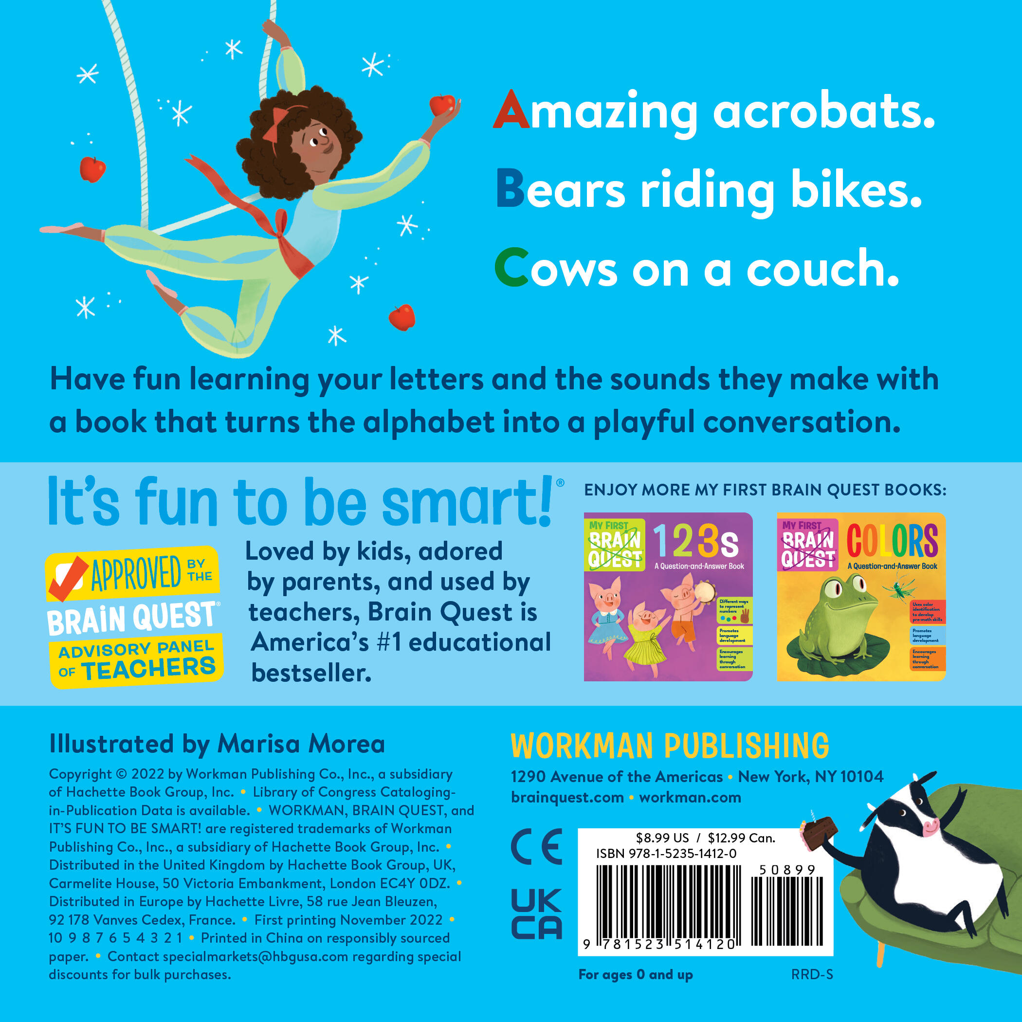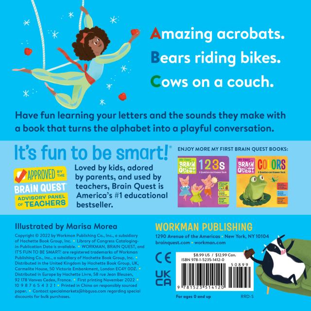 My First Brain Quest: ABCs is a delightful alphabet book that helps babies and toddlers learn the letters of the alphabet, expand their vocabulary, and develop phonics skills. Each letter of the alphabet is showcased with an engaging alliteration, a fun illustration, and questions that support conversation about counting, colors, comparison, and more. Smart, colorful, grounded in educational principles, and reviewed by a panel of early learning experts this board book introduces the alphabet in a bright, engaging way.